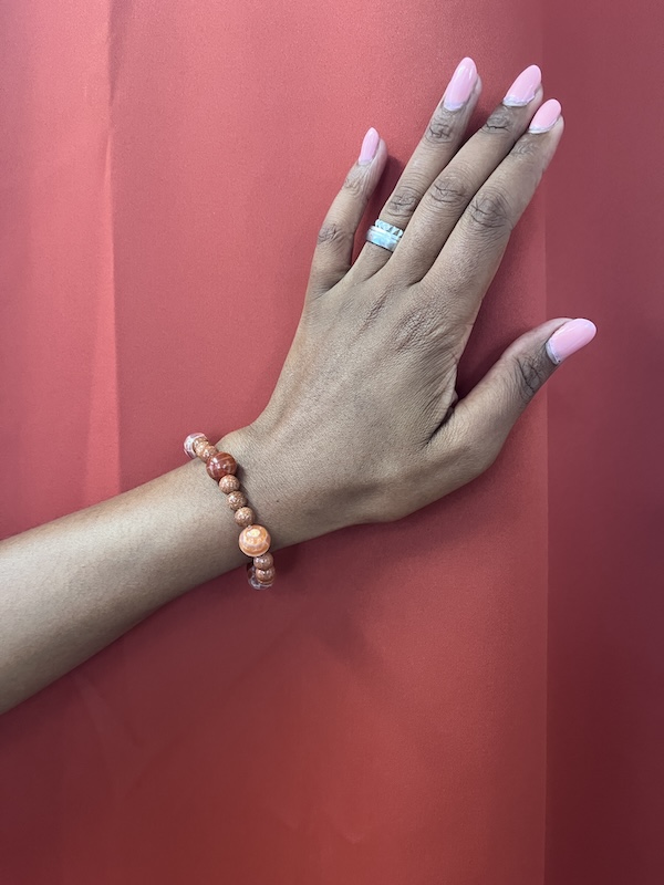 Een bruinige steen met goude glittertjes die prachtig staat in herfst en winter maar ook je zomerse jurk helemaal aankleed.