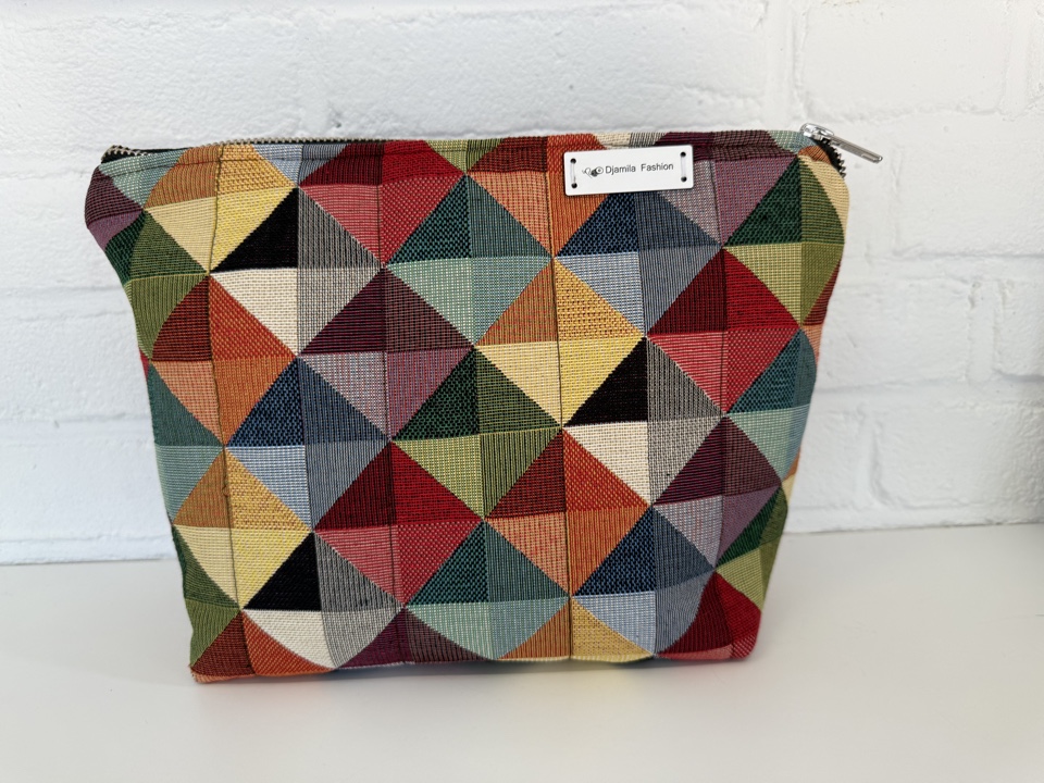 Voeg een vleugje kleur en stijl toe aan je dagelijkse routine met deze unieke, handgemaakte make-up tas van Djamila Fashion.